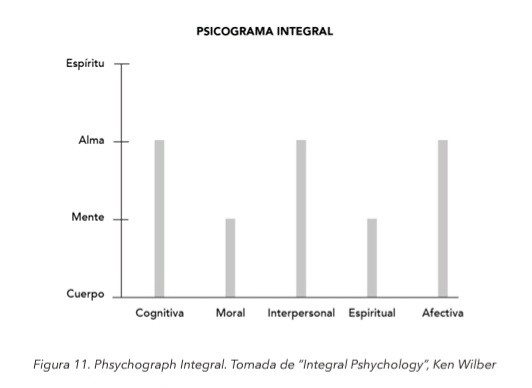 Secondo Wilber, tutto questo può essere rappresentato come nel grafico qui sopra, che è lo “psicogramma integrale”. Sull’asse verticale sono indicati i livelli della Grande Catena, attraverso i quali “corrono” le varie “linee”. Delle circa due dozzine di linee, cinque sono elencate a titolo di esempio: cognitiva, morale, interpersonale, spirituale e affettiva. Sia il livello più alto di ogni linea che una linea di sviluppo separata sono stati chiamati “spirituali”, riflettendo le due definizioni più comuni di spiritualità.
